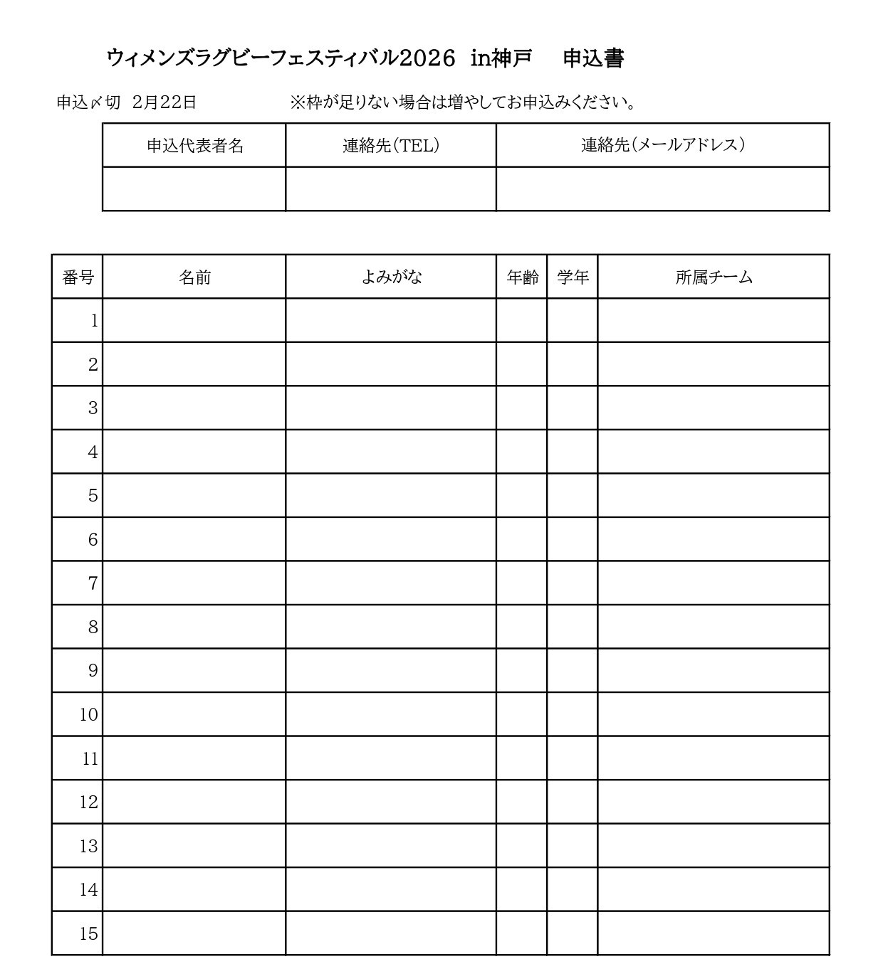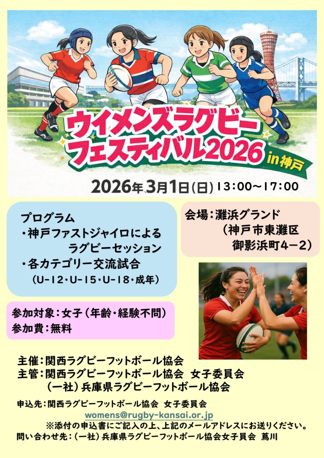 問合せ先:(一社)兵庫県ラグビーフットボール協会 女子員会 蔦川 tsuta.s.140@gmail.com