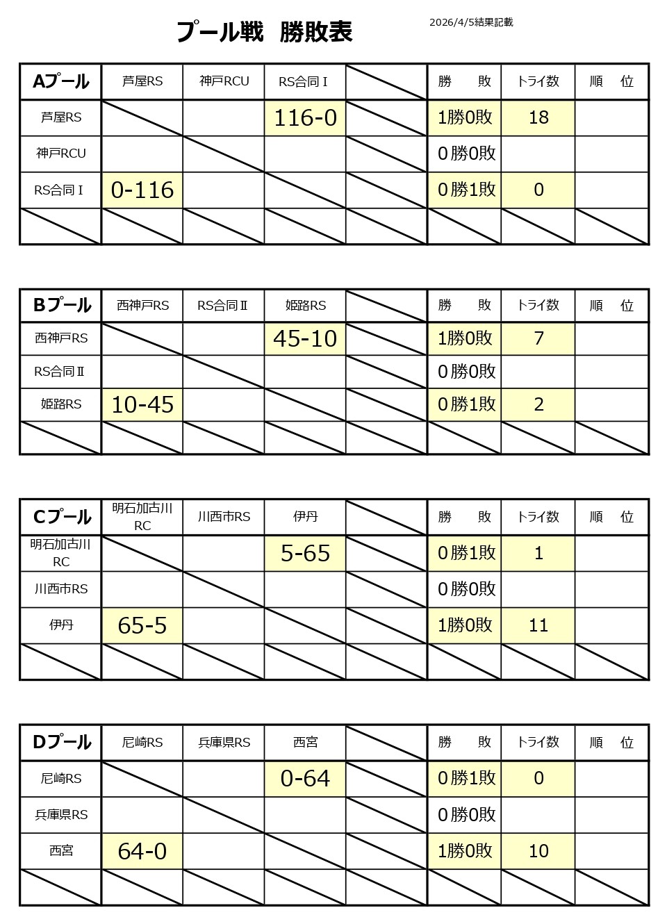 > 第29回兵庫県ジュニア・ラグビーフットボール大会(2026年度)春季大会、初日試合結果